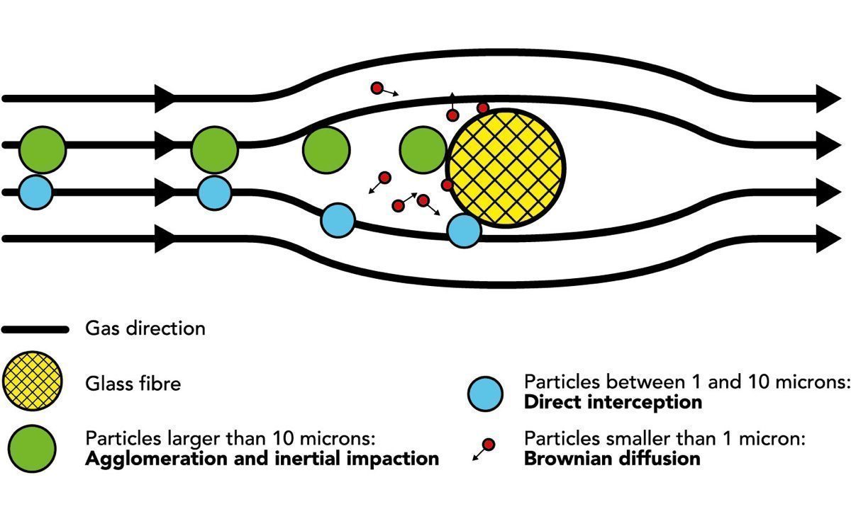 The particles are collected in three different ways: by agglomeration and inertial impaction, mainly for particles larger than 10 micron, by direct interception for particle sizes between 1 and 10 micron, and by Brownian diffusion for particles smaller than 1 micron.