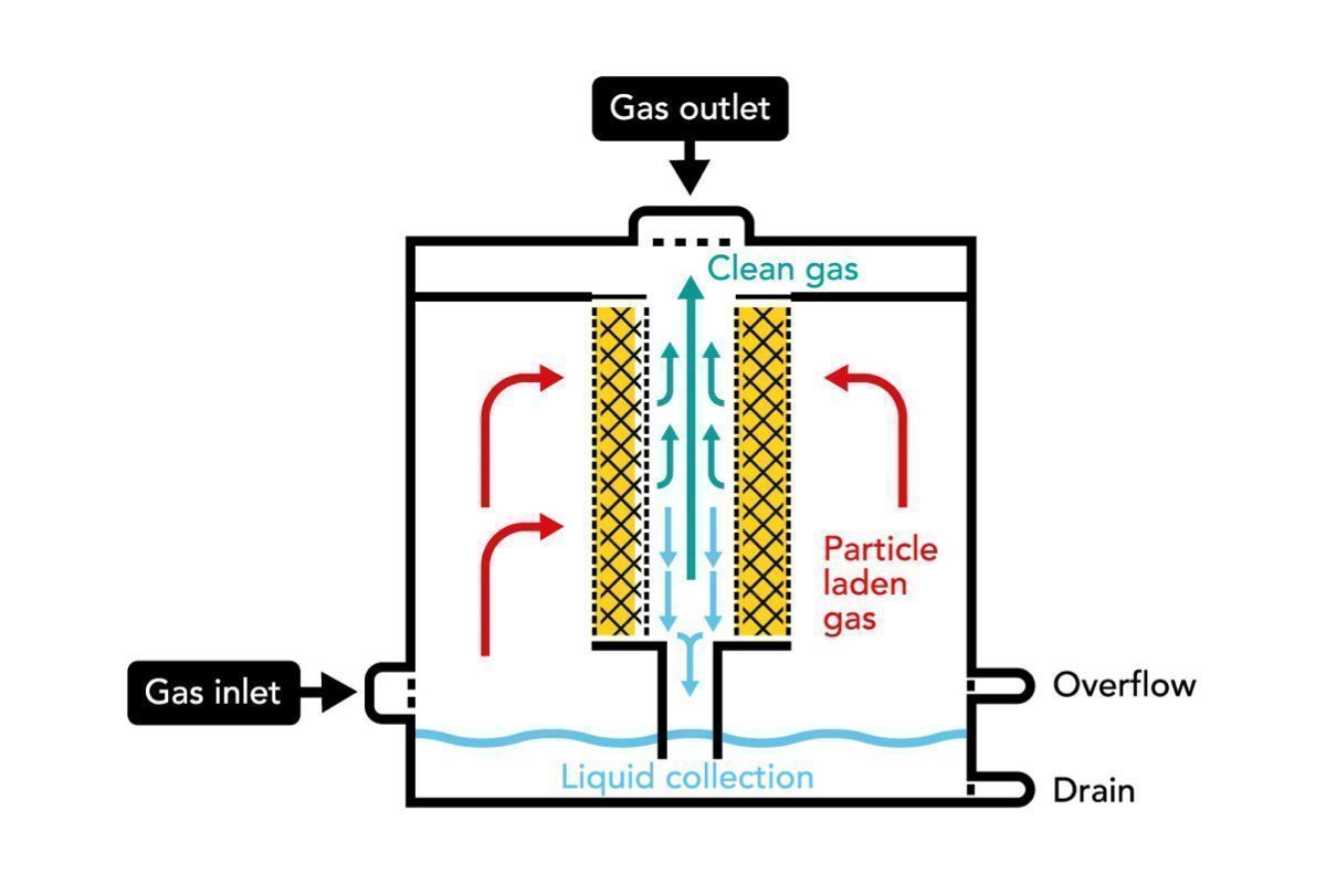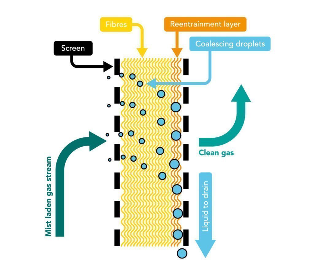 The gas is fed horizontally through a glass fibre bed. Particles are set in contact and collected on individual fibres of the bed and then coalesce to form liquid films and droplets. This liquid is transported through the bed by the gas flow. The collected liquid is then drained from the downstream face of the bed by gravity.