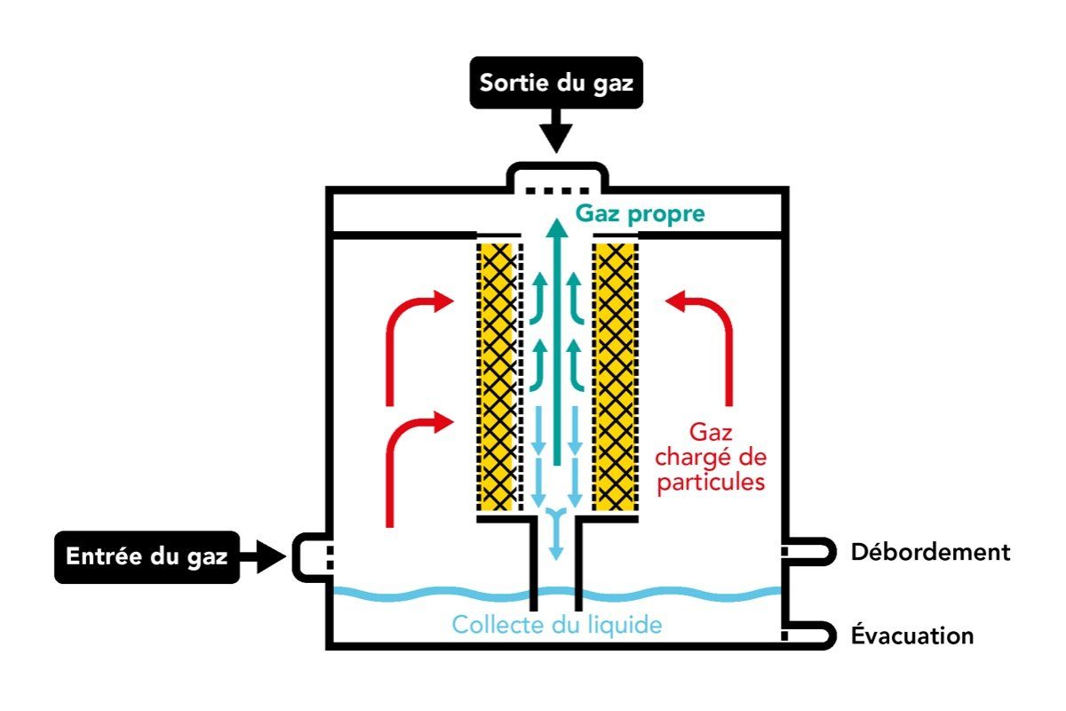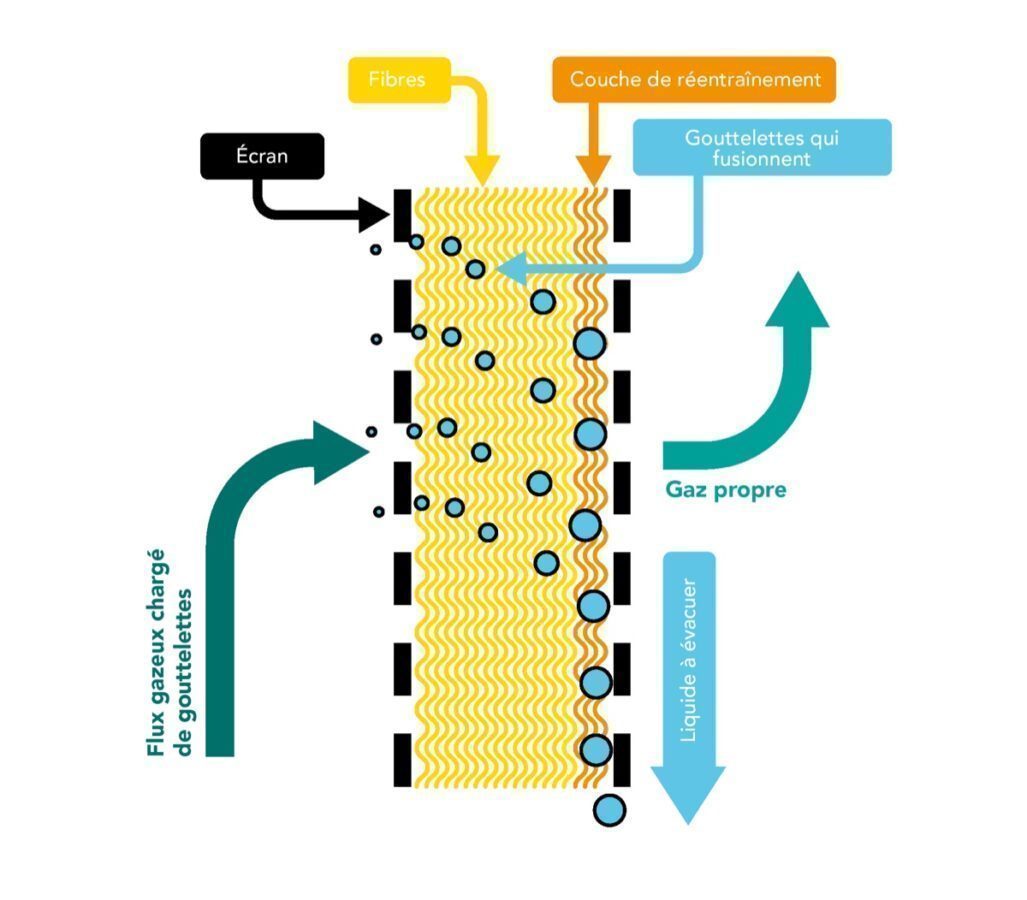 Le gaz est injecté à l’horizontale dans un lit de fibres de verre. Les particules sont mises en contact et collectées sur chaque fibre du lit, avant de fusionner pour former des films et gouttelettes liquides. Ce liquide est transporté dans le lit par le flux gazeux. Le liquide collecté est ensuite évacué par gravité du côté aval du lit.